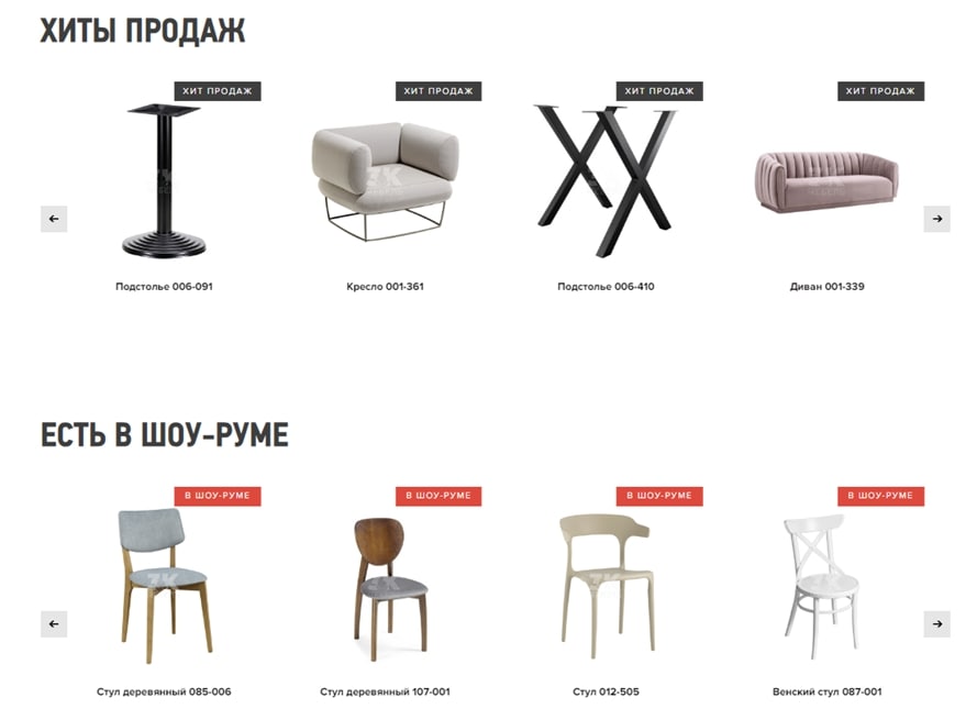 Изменена логика вывода товаров в каталоге – цены и кнопки у товаров теперь выводятся без наведения на них. Также добавлены плашки у товаров вида “Новинка”, “Хит продаж”, “В шоу-руме”: